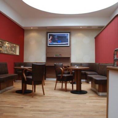 Tomu odpovídá celkový design interiéru, tj.maximální použití dřeva – ořech, zaoblené kulaté tvary, barevné ladění, řešení sezení, tj. pohodlné lavice a lehká křesla